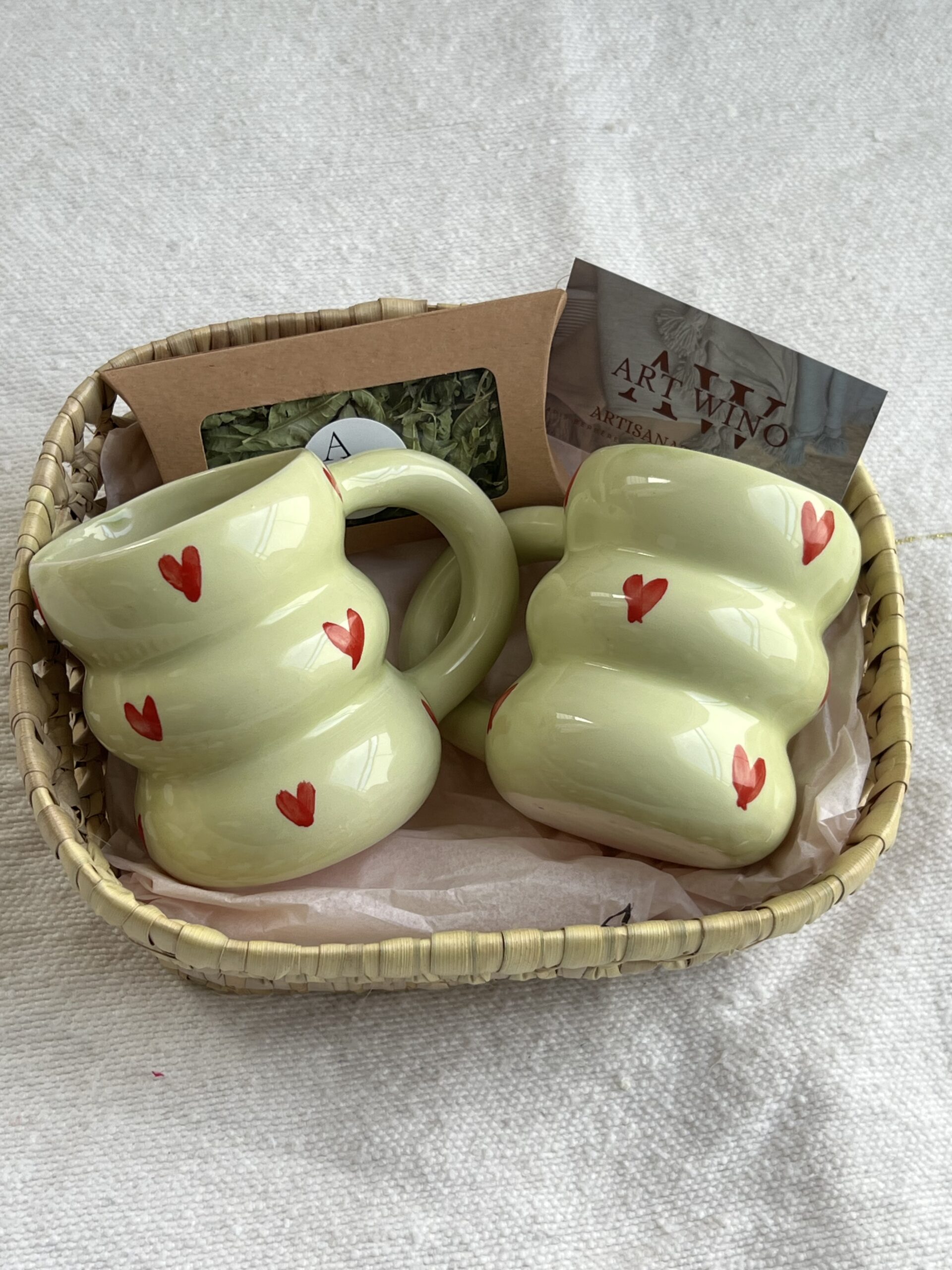 Deux tasses artisanales façonnées à la main, aux lignes simples et élégantes.
